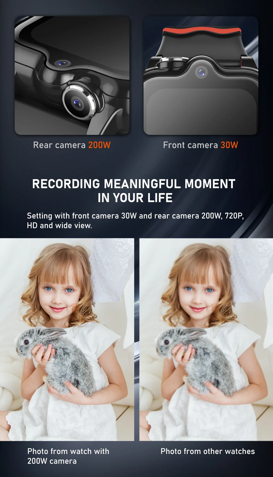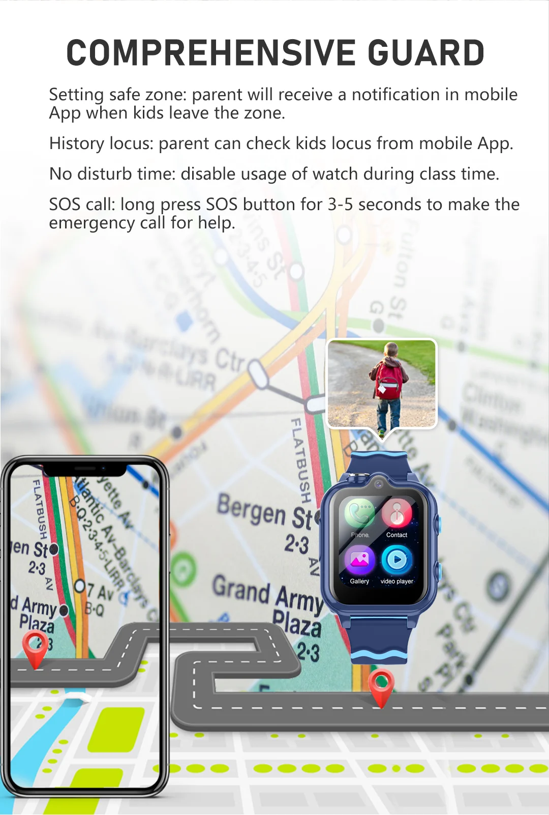 • Others: No disturbing time, SMS alerts(low-voltage remind/SOS remind), Remote shutdown, Alarm clock, Watch finder, math game, Class schedule, Make friend, Camera, Rewards, Bluetooth, App store, WhatsApp, Google translate,Mp4 player, Music player, recorder., etc..