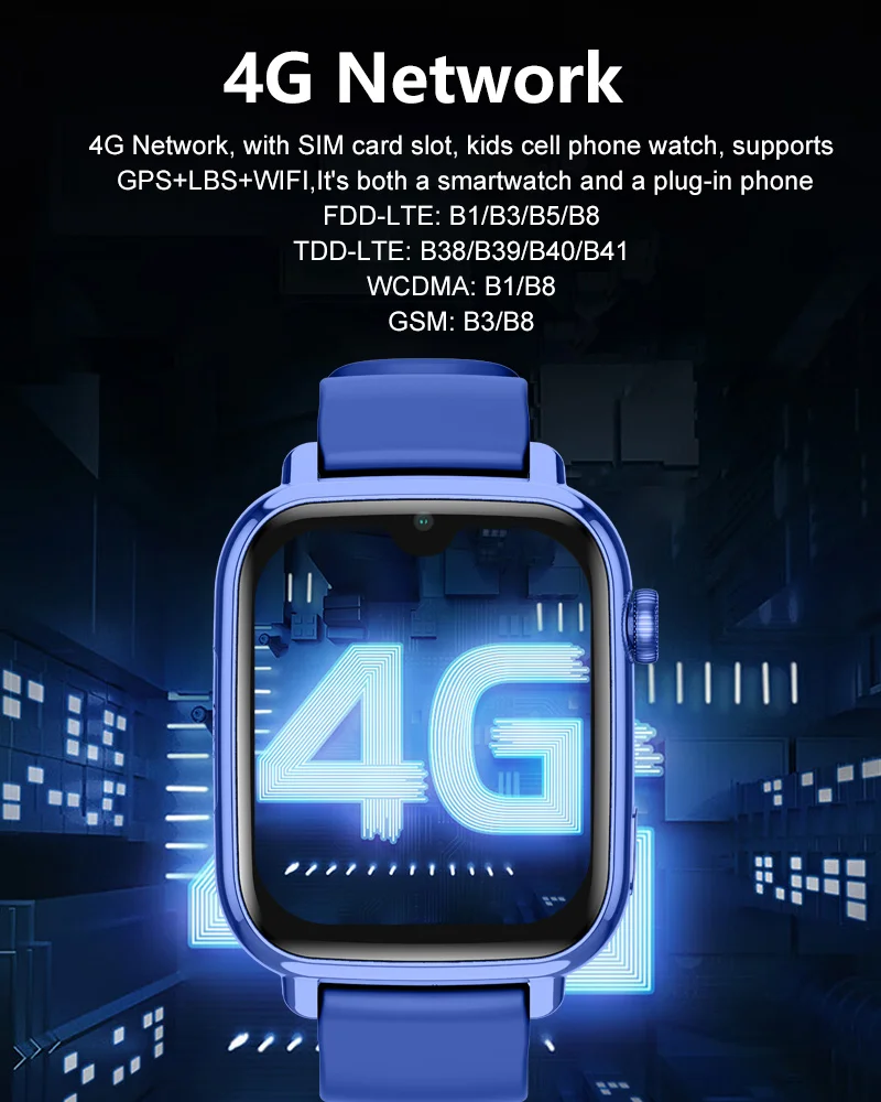 - 4G Smartwatch for Kids: Supports 4G network, WiFi, 1 cameras, album, two-way call, video call, GPS tracker, SMS, voice message, SOS, pedometer, class schedule, do not disturb (class mode), alarm clock, reject unknown call, music player, video player, calculator, calendar,