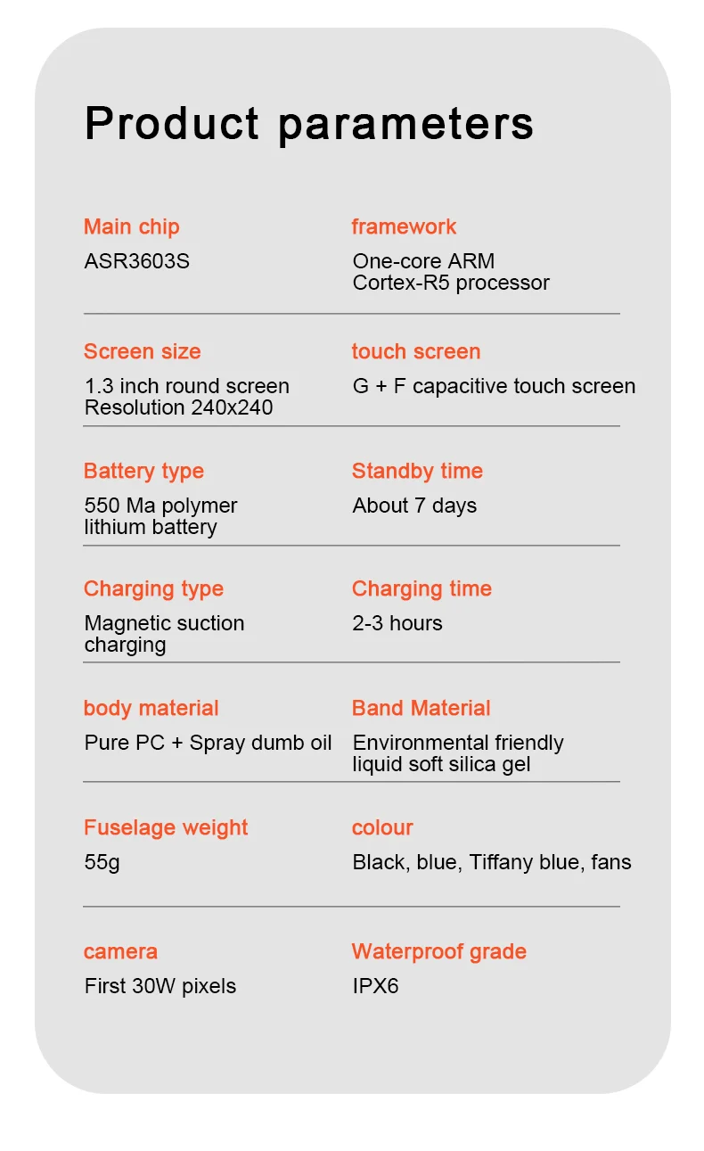 • Display Screen:1.3 inch IPS HD round screen 240X240